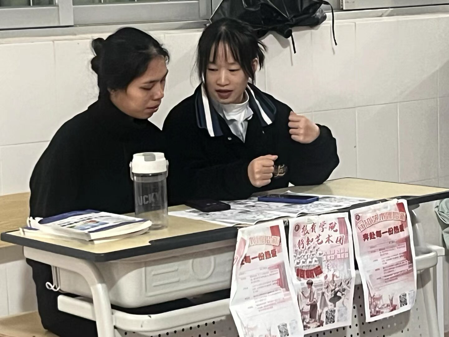 教育学院行知艺术团招新活动在校园内展开。桌前,招新成员就艺术团的舞蹈、声乐、戏剧等多元方向进行讨论,桌上张贴的招新海报,不仅展示了社团过往演出风采,还清晰标注了报名流程与面试信息。从零基础友好政策到丰富的舞台资源,招新成员的讲解让不少怀揣艺术热爱的同学驻足停留,或询问细节,或扫码报名现场既洋溢着青春的热情,为校园文化注入了鲜活的艺能气息。