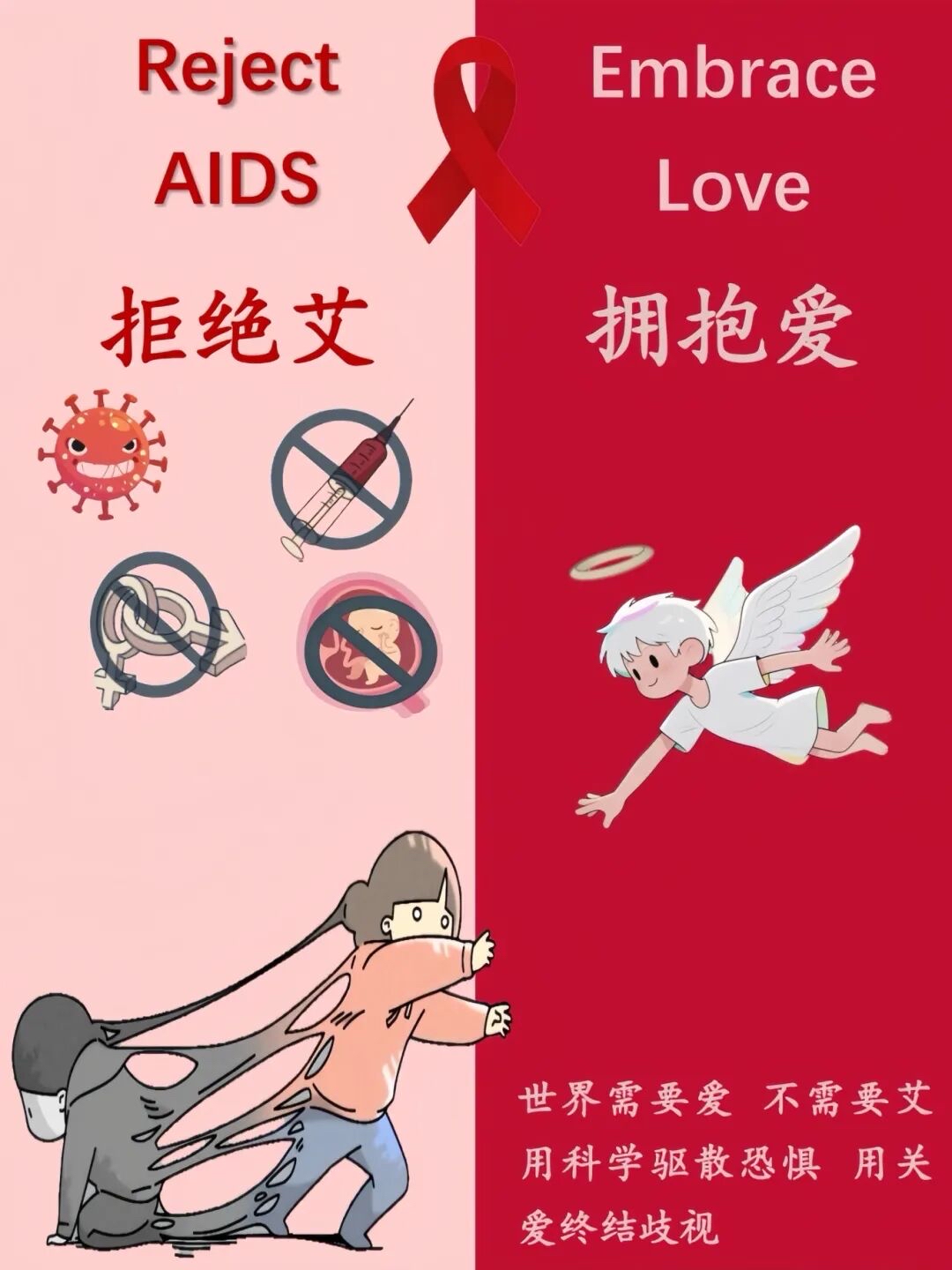 五、关爱包容,拒绝歧视:若身边有艾滋病病毒感染者,请以尊重代替偏见、以关爱传递温暖。歧视比疾病更伤人,包容的态度能帮助感染者更好地融入校园,也是文明校园的重要体现。