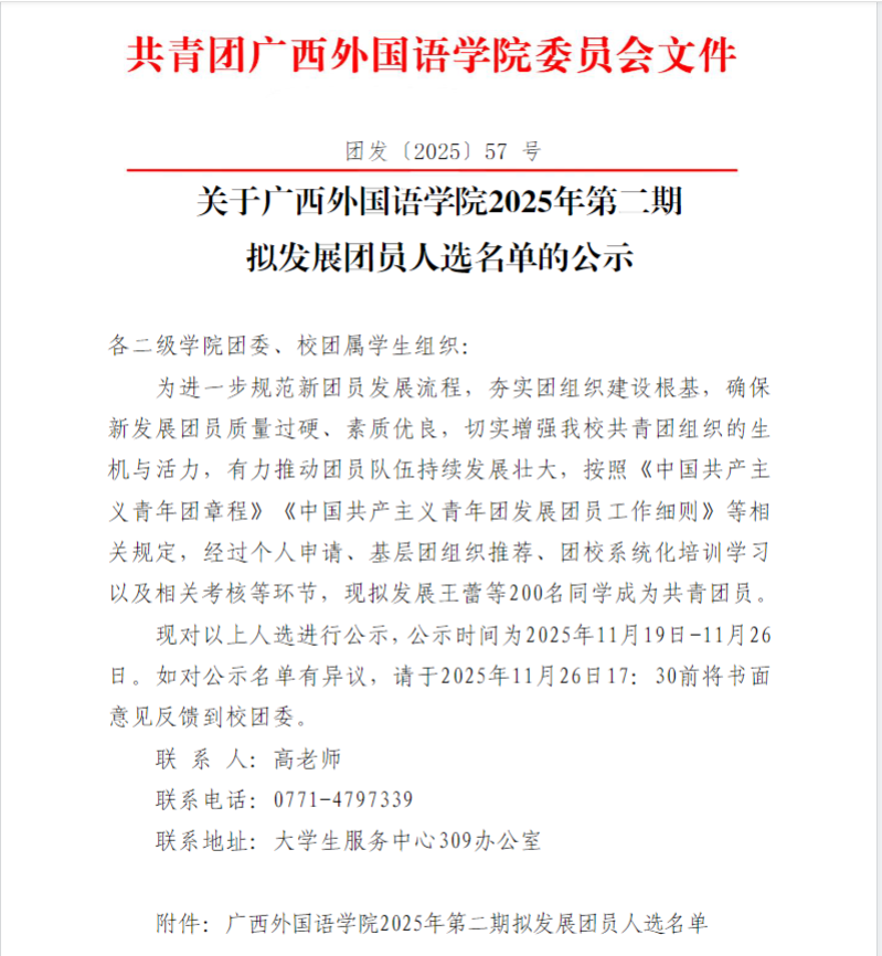 关于广西外国语学院2025年第二期 拟发展团员人选名单的公示