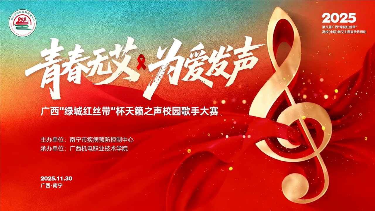 作为覆盖全区高校的区级赛事,本次大赛由南宁市疾病预防控制中心主办,以“青春无爱,为爱发声”为核心主题。它不仅是集中展现广西高校学子音乐才华的竞技平台,更是以文艺为载体传播红丝带精神、弘扬公益正能量的重要实践。大赛自启动以来,吸引了全区数十所高校的优秀选手同台竞技,竞争十分激烈。