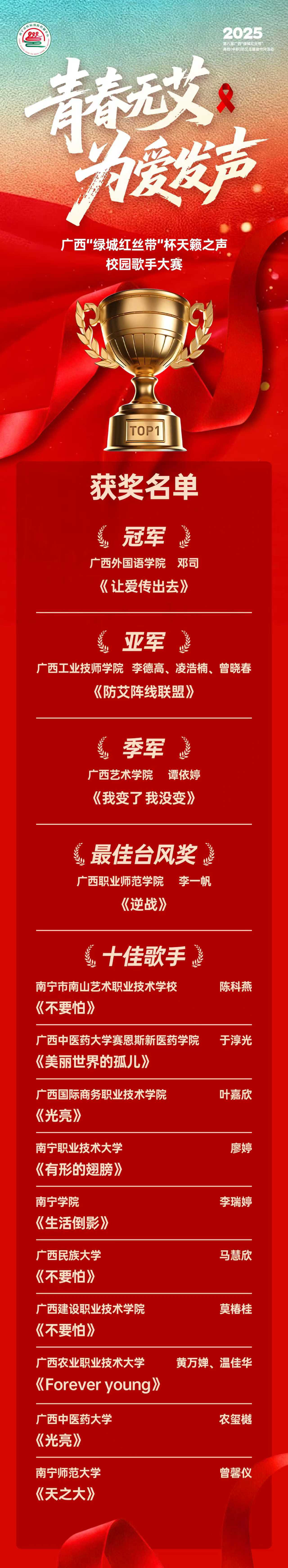 2025年11月30日,“青春无爱,为爱发声”广西“绿城红丝带”杯天籁之声校园歌手大赛在广西机电职业技术学院圆满落幕。我校教育学院邓司同学,在黎莉、邬巧、王伟男三位指导老师的悉心指导与专业助力下,凭借一首饱含温情的《让爱传出去》,以真挚的演唱、动人的舞台表现,成功斩获大赛冠军,用歌声生动诠释“红丝带”所承载的爱与温暖。