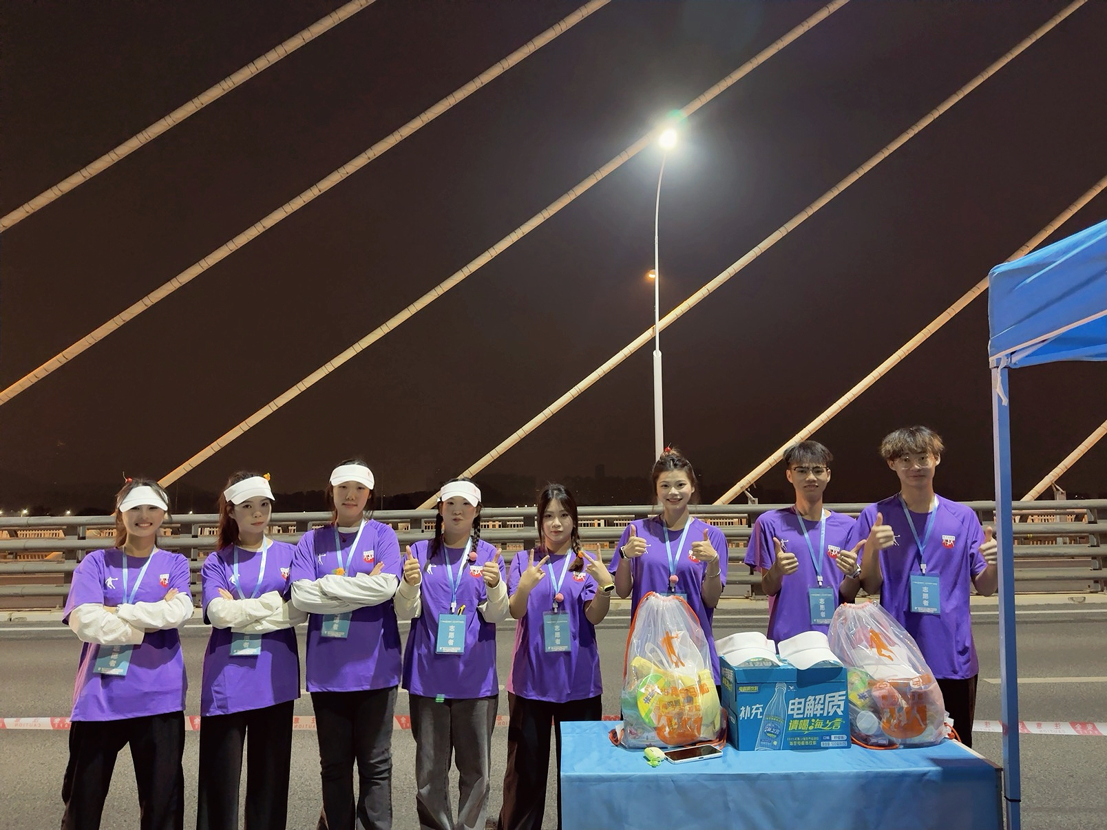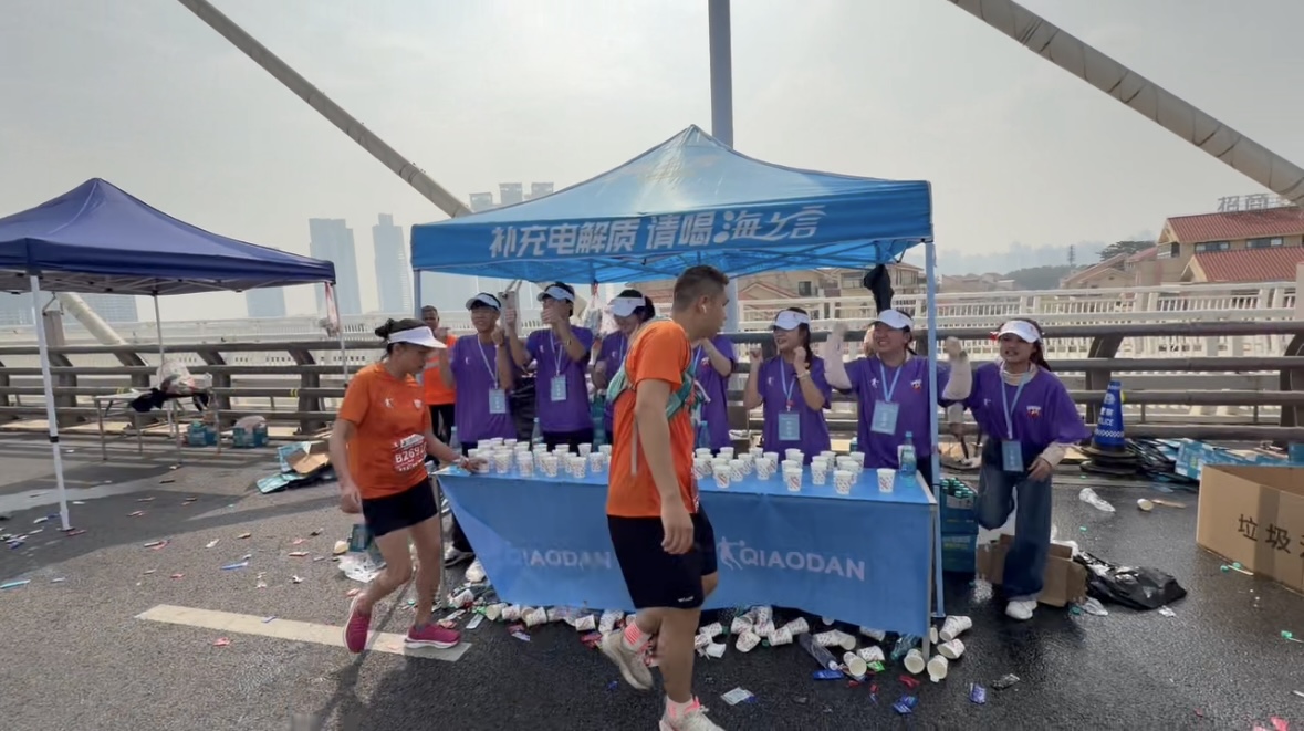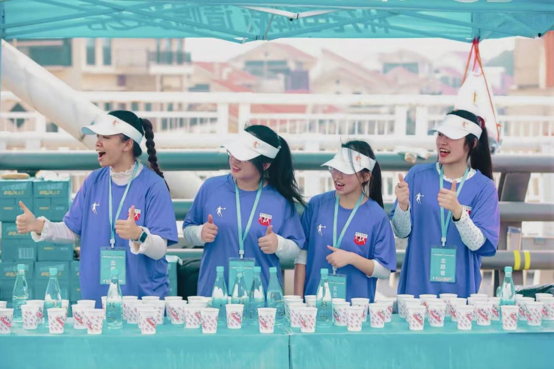 赛道沿线,教育学院志愿者们手脚麻利地为跑者递上饮用水、能量食品和新鲜水果,用一句句“加油”“坚持住”的呐喊,为选手注入前行力量。部分补给站的志愿者还与壮族阿妹共同演绎民族舞蹈,让跑者在奔跑中沉浸式感受壮乡文化魅力。医疗观察志愿者则时刻紧盯赛道情况,配合医护人员、急救跑者构筑全方位医疗防护网,及时为身体不适的选手提供基础救助和心理安抚,守护每一位跑者的安全。从凌晨5时到中午赛事结束,志愿者们始终坚守岗位,用微笑和汗水将周到暖心的服务渗透到赛事每一个环节。