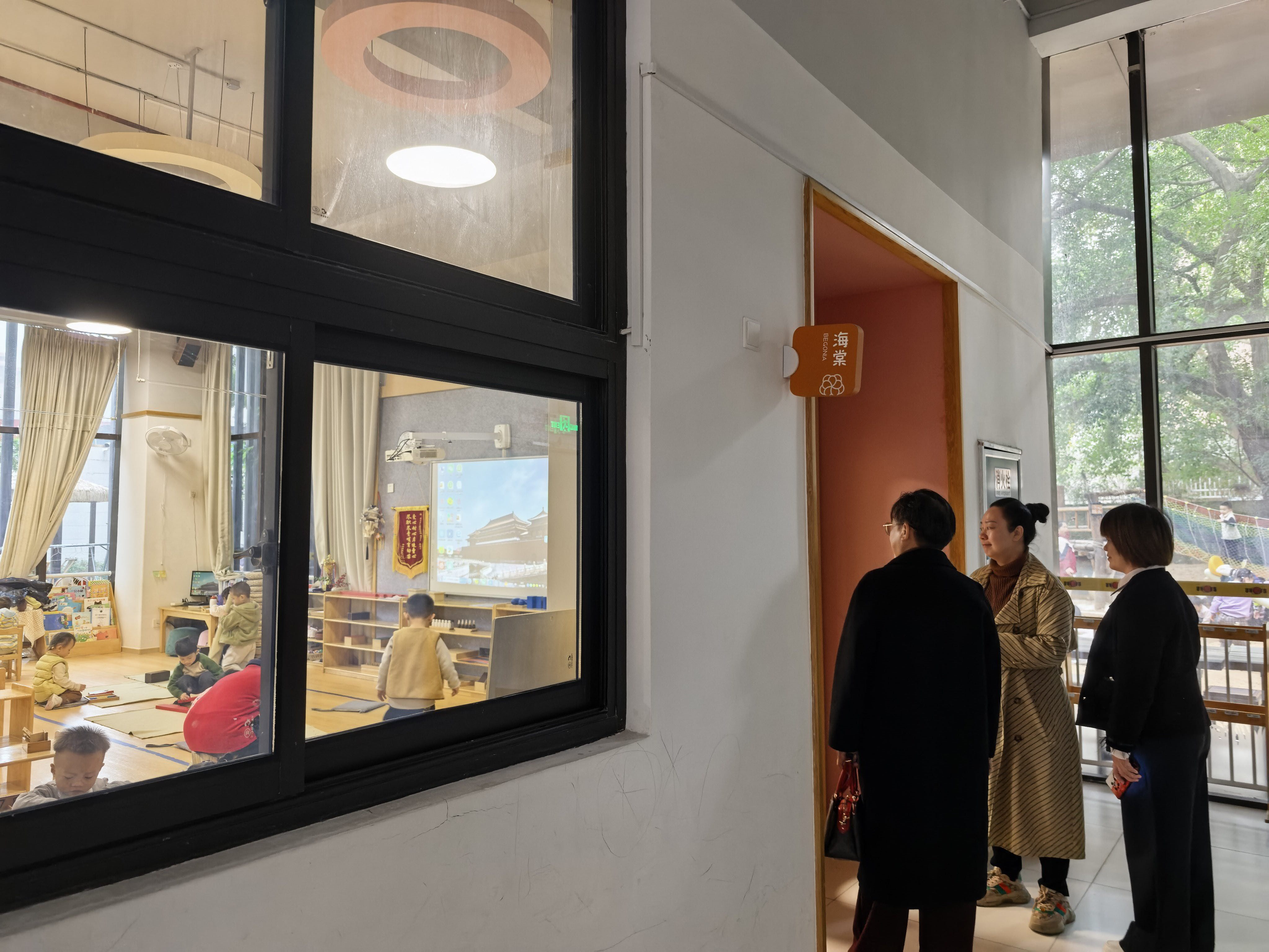 座谈会结束后,在易园长的陪同下,访企团队实地参观了百益集团旗下的直属幼儿园南宁市阿诺的幼儿园。团队先后走访了蒙氏教室、绘本阅读区、创意美工室、户外活动场地等功能区域,详细了解了幼儿园的环境创设、课程实施、师资配备等情况。