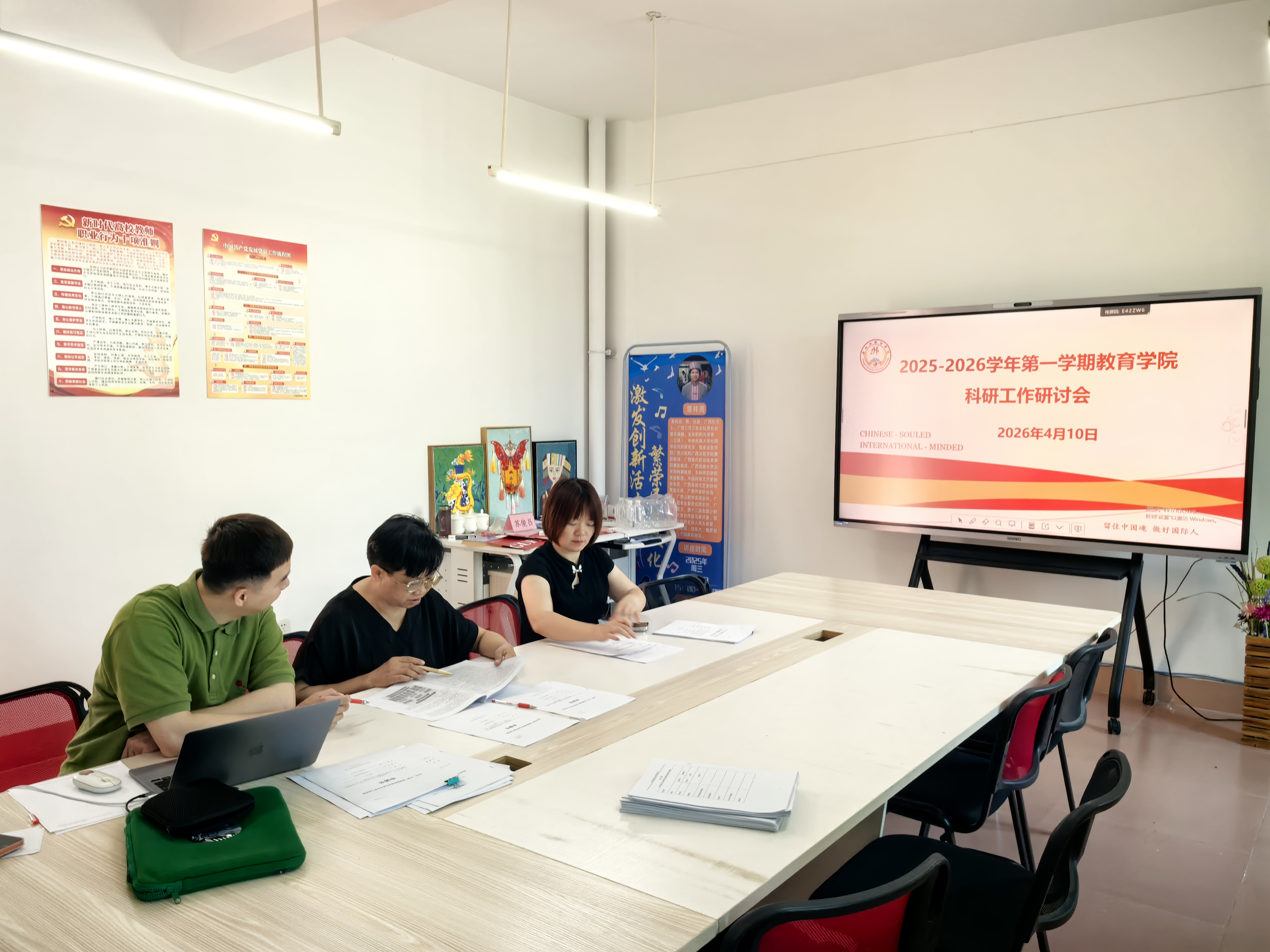 2026年4月15日,广西外国语学院教育学院在知新楼B226召开2025—2026学年第一学期科研工作研讨会暨区级教育教学改革项目院内评审会。教育学院执行院长黄萍、副院长黄丹丹、农伟挂居博士参会,就新学期科研工作谋划和区级教改项目院内评审与推优工作进行了集中讨论。