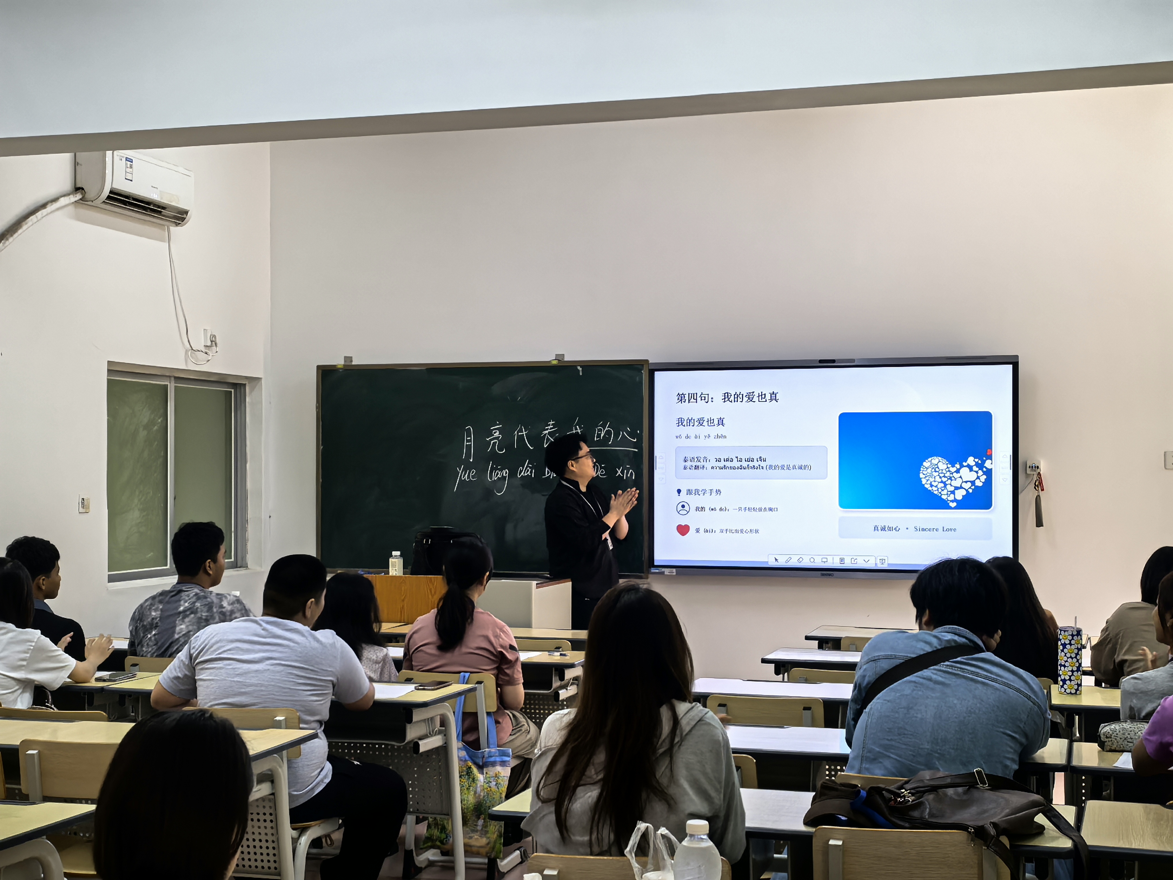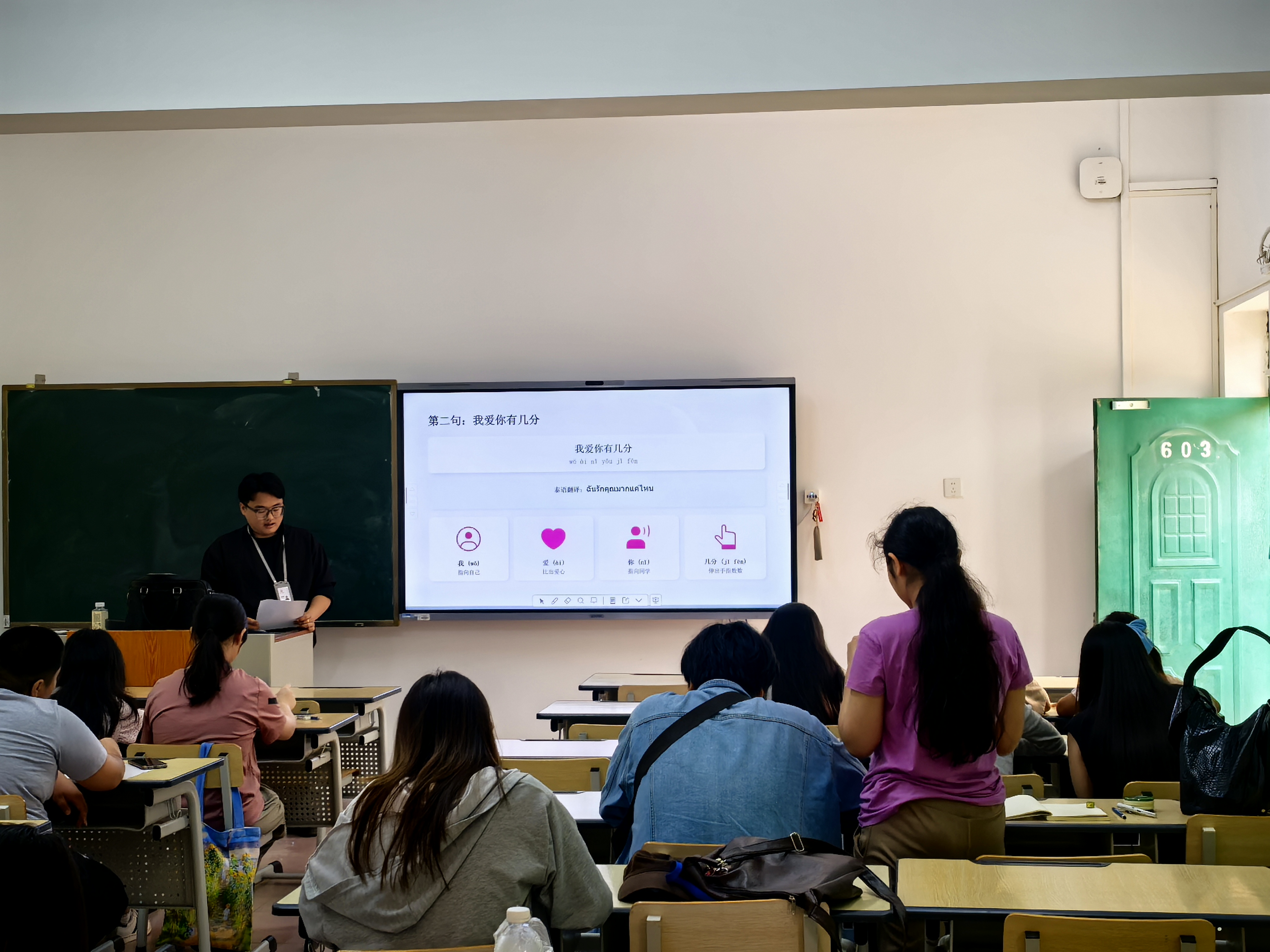 课程伊始,蔡宇涛老师选择了一首在中国家喻户晓、在海外也极具传唱度的歌曲——《月亮代表我的心》。这不仅仅是一次简单的音乐教学,更是一场精妙的文化导入。蔡老师深知语言是第一道门槛,他耐心细致地将歌词逐字拆解,以“中文-泰语”双语对照的方式,反复教习发音。从你-คุณ到爱-รัก,每一个音节,他都亲自示范,并引导学生们体会中文声调的婉转之美。
