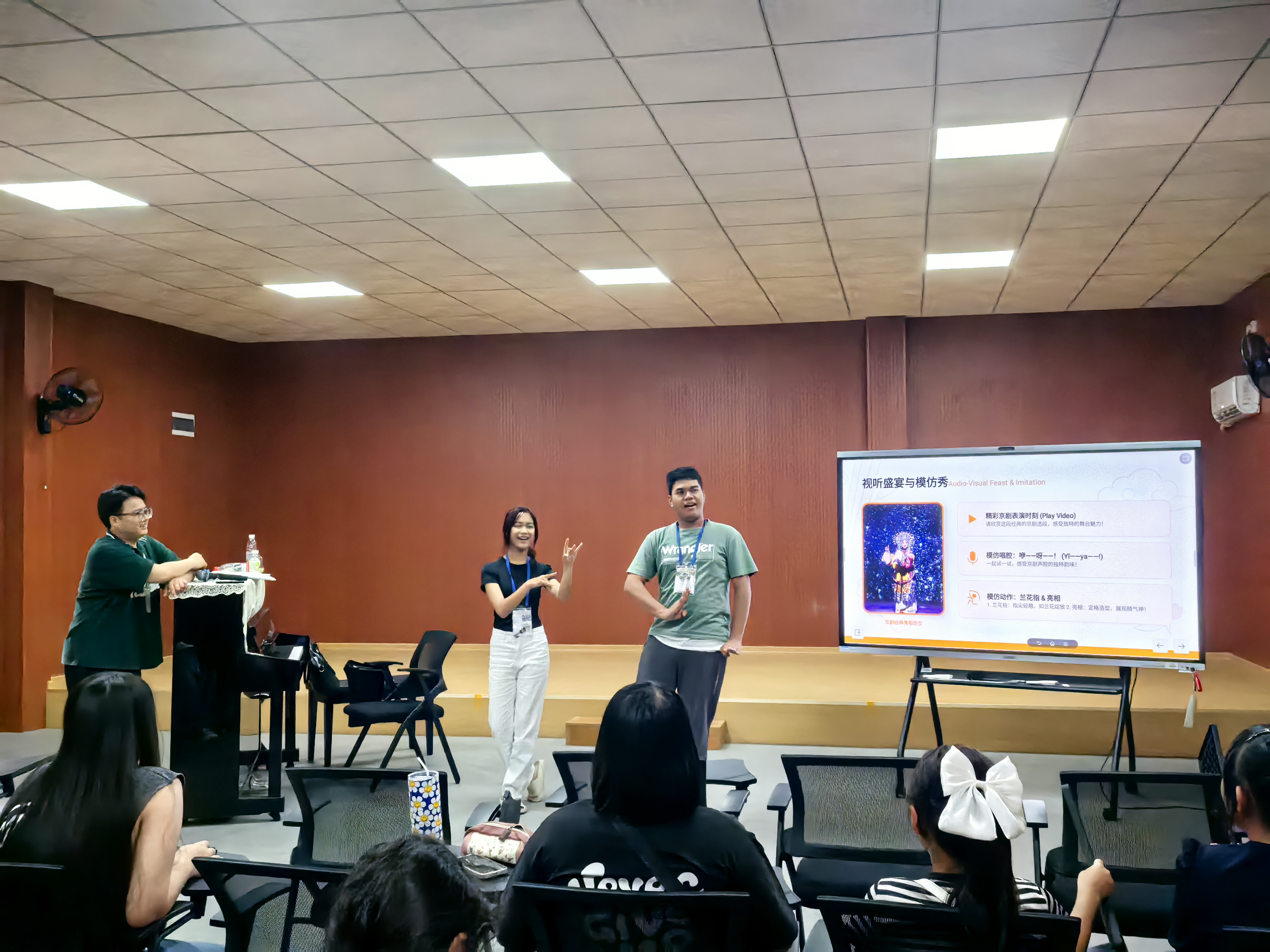 “‘月亮’在东方文化里,常常寄托着思念与永恒的情感。”蔡老师没有停留在字面教学,而是以小见大,深入浅出地讲解歌词背后的文化意蕴,让泰国同学们不仅知其然,更知其所以然。从最初的生涩模仿,到逐渐理解词义后的情感投入,教室里的气氛在蔡老师的引导下愈发热烈。当旋律响起,泰国同学们从hesitant(迟疑)的跟唱,到最后能看着歌词完整、自信地演唱,这不仅是教学的成功,更是文化共鸣的生动体现。