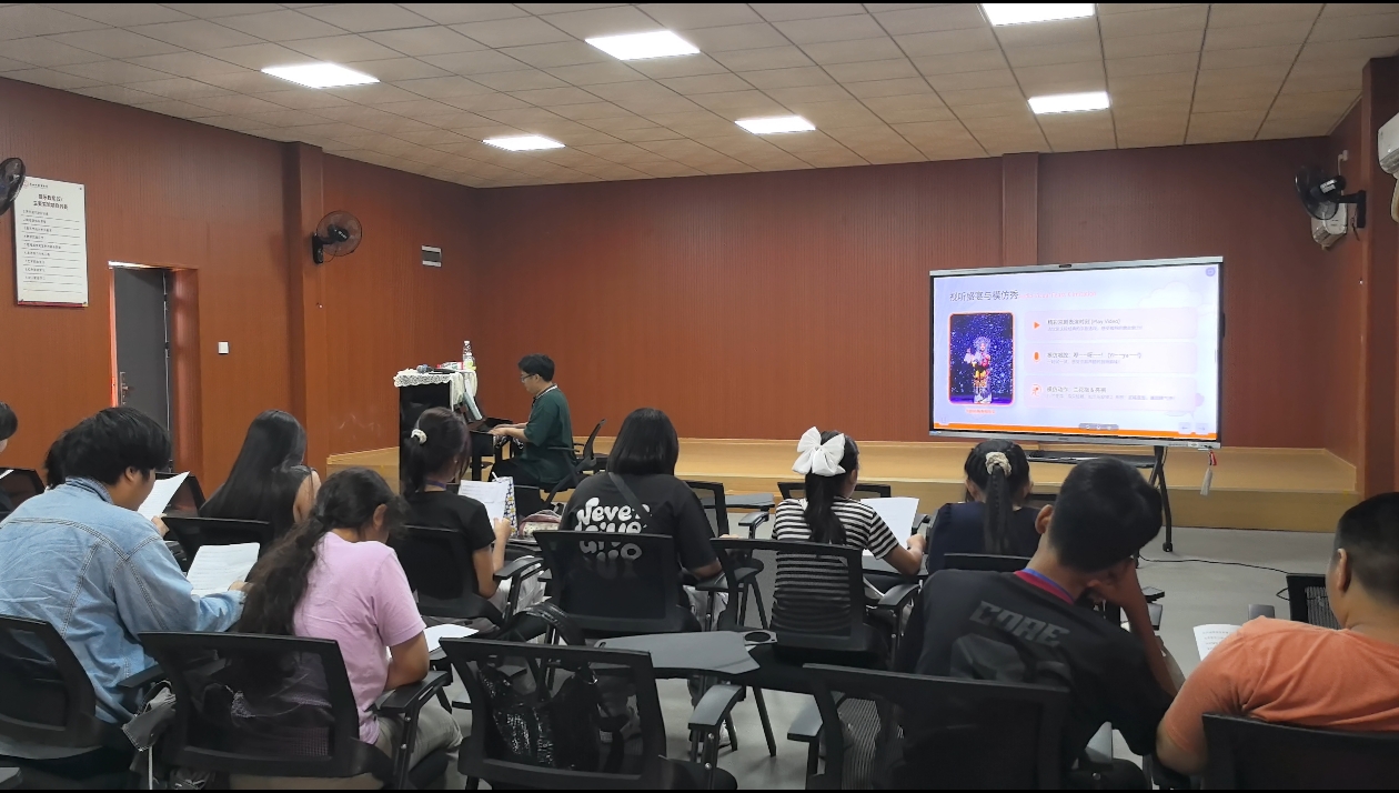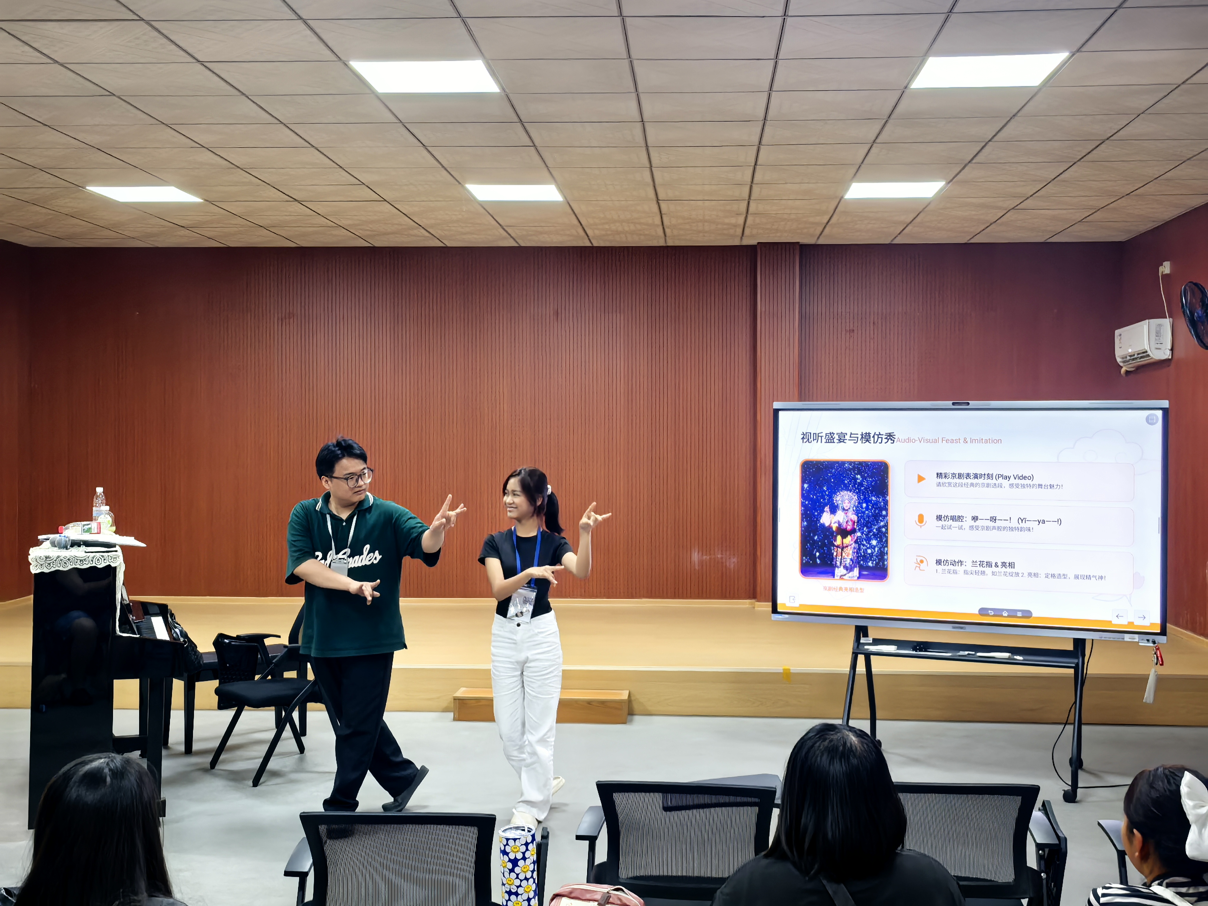 理论讲解远不如亲身体验来得深刻。蔡老师邀请了一名男同学和一名女同学走上讲台,亲自传授京剧的基本功。“来,跟我学,气沉丹田,声音从这里发出来:咿——呀——”他示范着京剧独特的男女唱腔,两位同学认真模仿,略显夸张的表情和腔调引得台下笑声与掌声一片。随后,蔡老师又手把手地教他们“兰花指”的优雅姿态和“亮相”的精气神。这看似简单的动作,却蕴含着中国戏曲程式化的美学精髓。台上的同学学得有模有样,台下的同学们更是按捺不住,纷纷伸出手指,模仿着兰花指的造型,整个课堂变成了一个欢乐而富有韵味的京剧大戏台。
